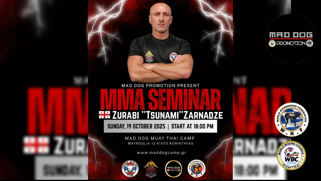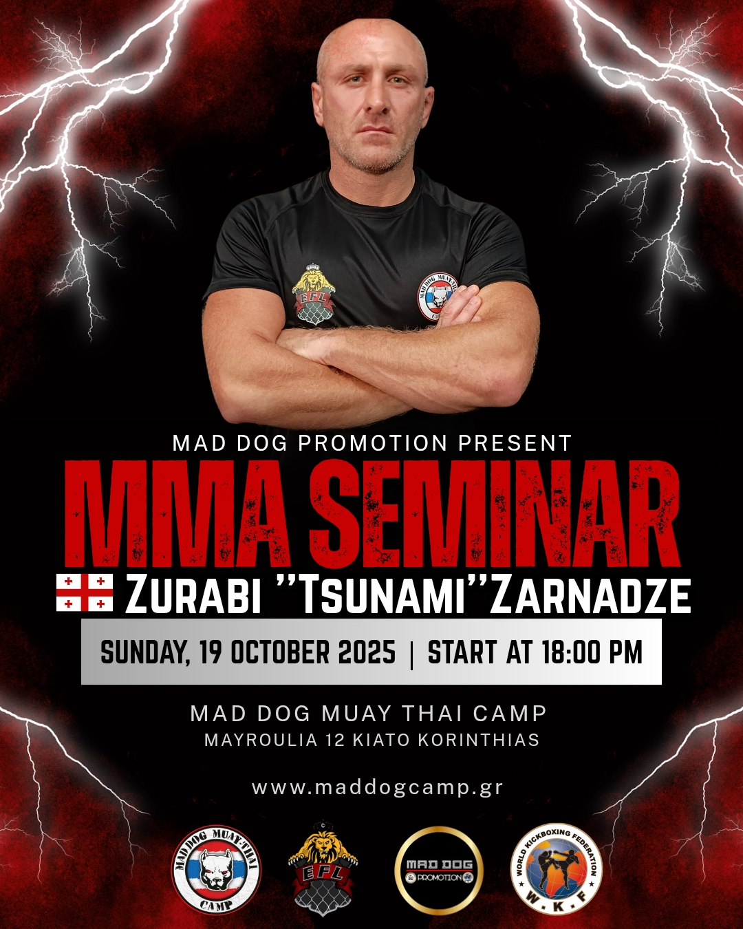 Το Mad Dog Camp σε συνεργασία με το EFL Academy παρουσιάζει ένα μοναδικό σεμινάριο ΜΜΑ με τον καταξιωμένο αθλητή Ελληνικού MMA, Zurabi ‘Tzunami’ Zernatze.